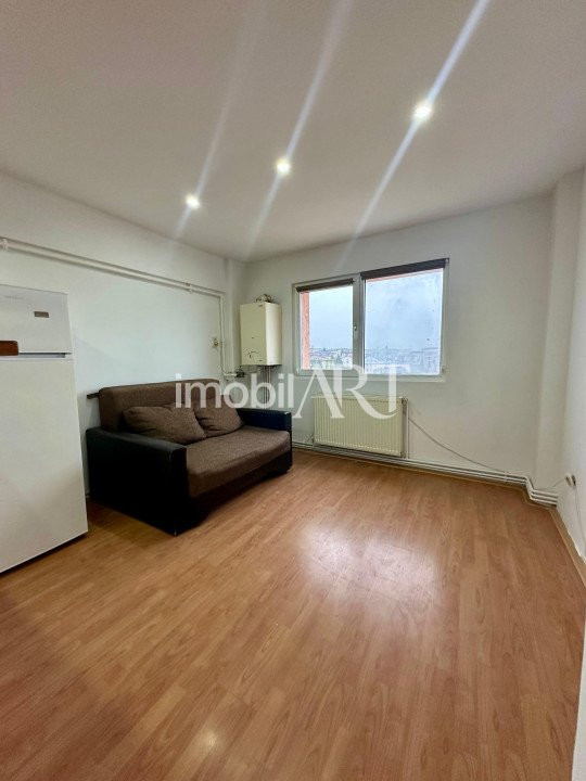 Se închiriază apartament cu o cameră, bucătărie open space, baie și hol, situat la etajul 8 al unui bloc cu lift, în zona UM. Apartamentul este complet mobilat și utilat, incluzând frigider, mașină de spălat rufe, mașină de spălat vase, aragaz și alte electrocasnice necesare.