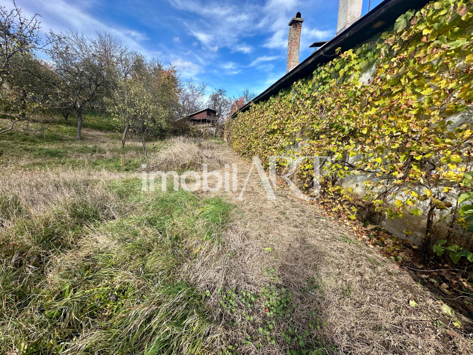 Curtea este superbă, plină de viață, cu viță de vie în jurul casei și pomi fructiferi, oferind un spațiu perfect pentru relaxare și grădinărit.
